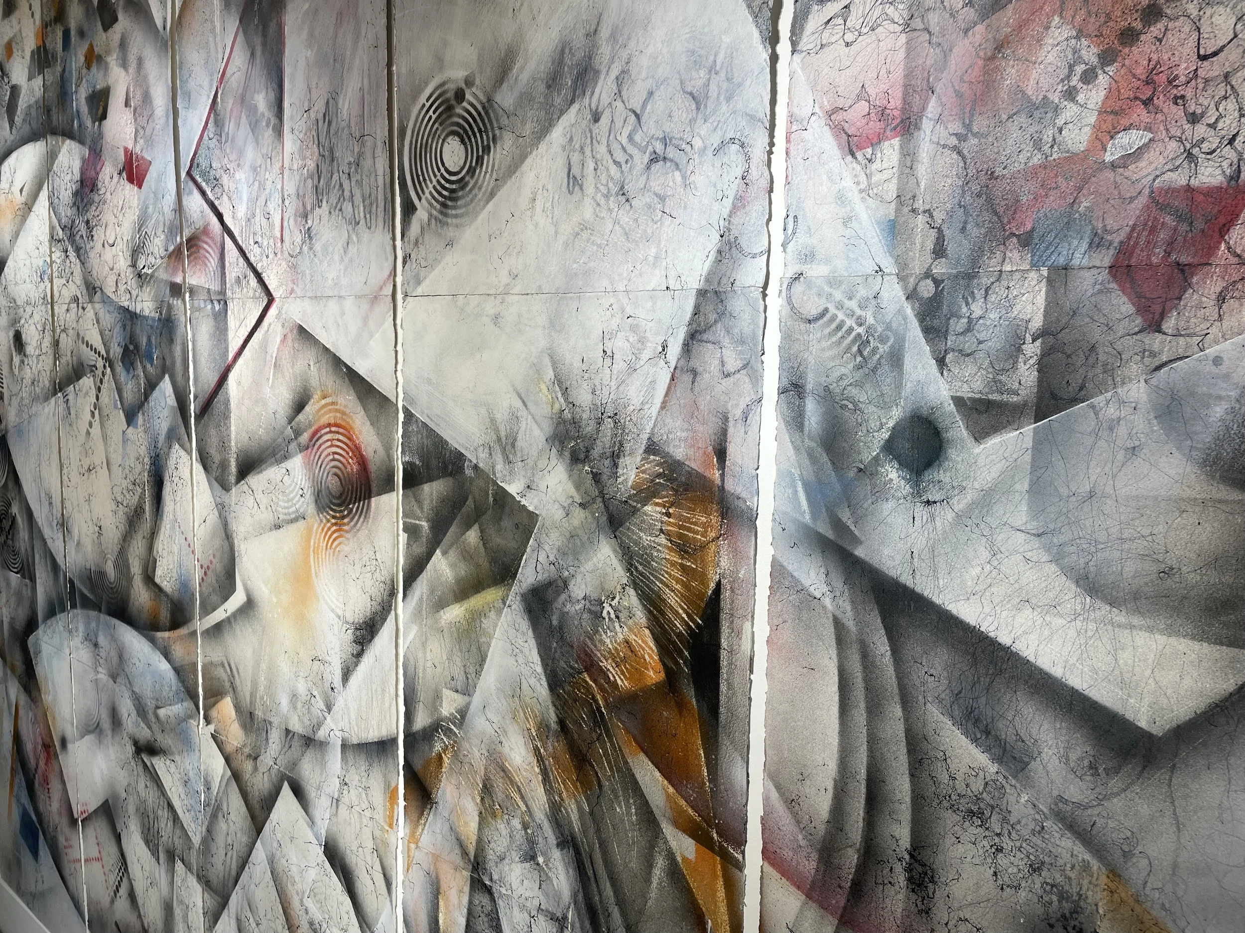 5 pieces. Each 250 x 280 cms. Pen and ink, spray paint, acrylic printing, acrylic gesso and industrial sander on sheets of Arches rough 300 gsm paper. Exact dimensions and layout of each piece varies according to location. 2022-2025.